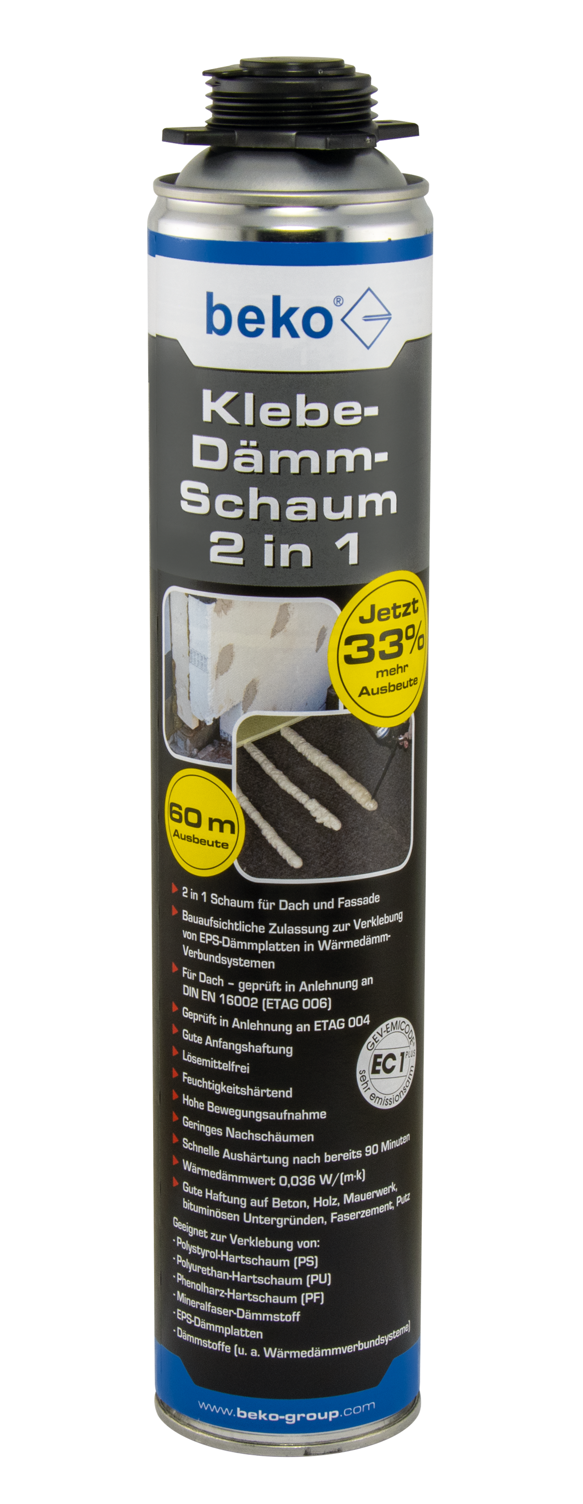 2 in 1 Schaum für Dach und Fassade, für Dach – geprüft in Anlehnung an DIN EN 16002 (ETAG 006), geprüft in Anlehnung an ETAG 004, GEV-EMICODE® EC 1Plus – sehr emissionsarm, bauaufsichtliche Zulassung zur Verklebung von EPS-Dämmplatten in Wärmedämm-Verbundsystemen, gute Anfangshaftung, lösemittelfrei, feuchtigkeitshärtend, hohe Bewegungsaufnahme, geringes Nachschäumen, schnelle Aushärtung nach bereits 90 Minuten, wasserfest, Wärmedämmwert 0,036 W/(m.k).